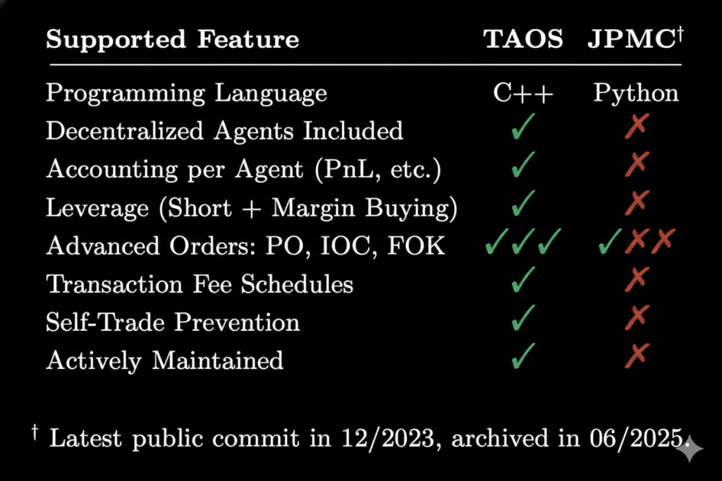 For more information about the theoretical underpinnings of the framework and its potential real-world applications, with current limitations, see our white paper. For a quick comparison to an existing framework supported by JP Morgan Chase, see below, giving an idea of the extensive features built into the decentralized TAOS framework.